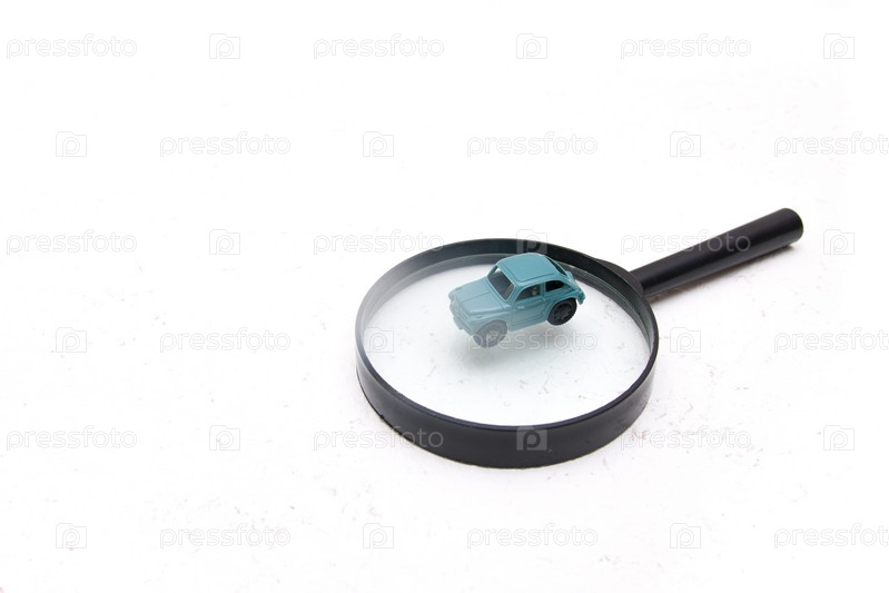 Маленькая игрушечная машинка на белом фоне с лупой, копией пространства, поиском машины, диагностикой проблем и покупкой концепции автомобиля