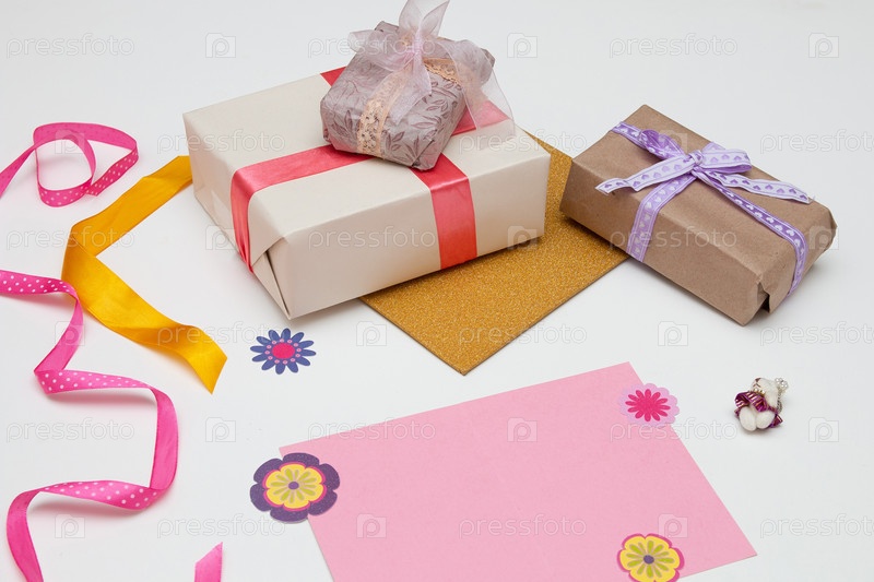 Подарочные коробки с яркими лентами и бантами на белом фоне, розовая открытка, мишки для украшения, пространство для копирования, вид сверху, день рождения, день благодарения, праздник, новый год, рождество, плоская планировка