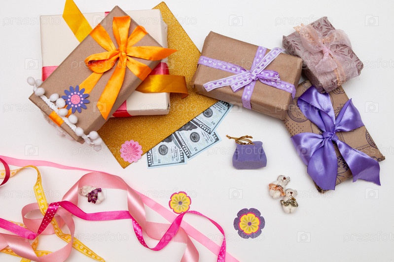 Подарочные коробки с яркими лентами и бантами на белом фоне, деньги, долларовые купюры, евро, пространство для копирования, вид сверху, день рождения, день благодарения, праздник, новый год, рождество, плоская планировка
