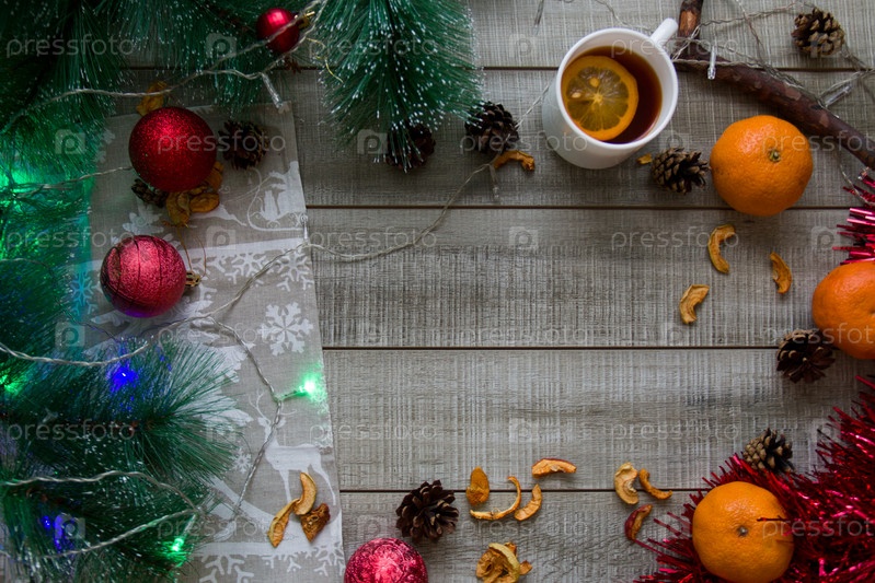 Рождественский фон, зимнее настроение, копия пространства, вид сверху на серый деревянный фон, сосновые ветки, гирлянда, чашка чая с лимоном, шишки, ветка, сухофрукты