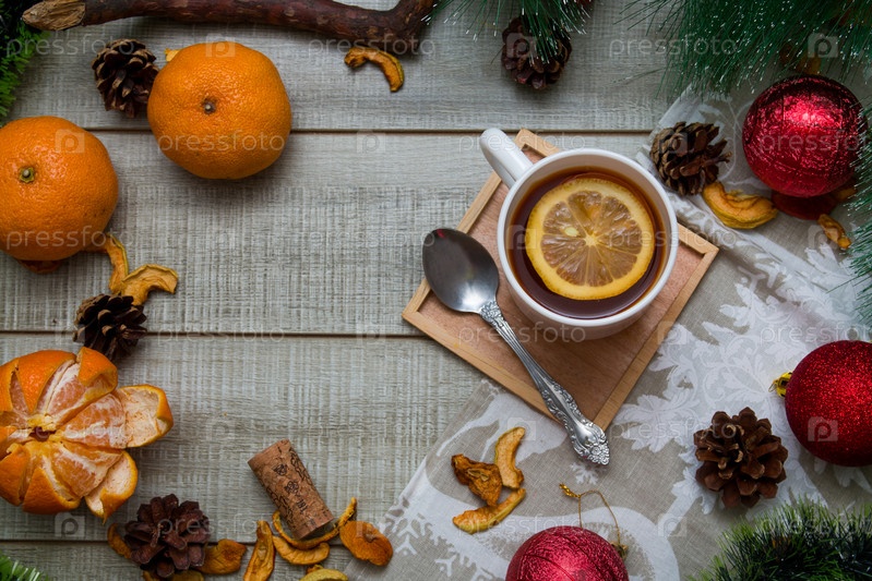 Чашка чая с лимонным новогодним декором на деревянном фоне серый стол, зеленая ветка сосны, мандарины, ложка, сухофрукты, елочные шары, вид сверху, копия пространства