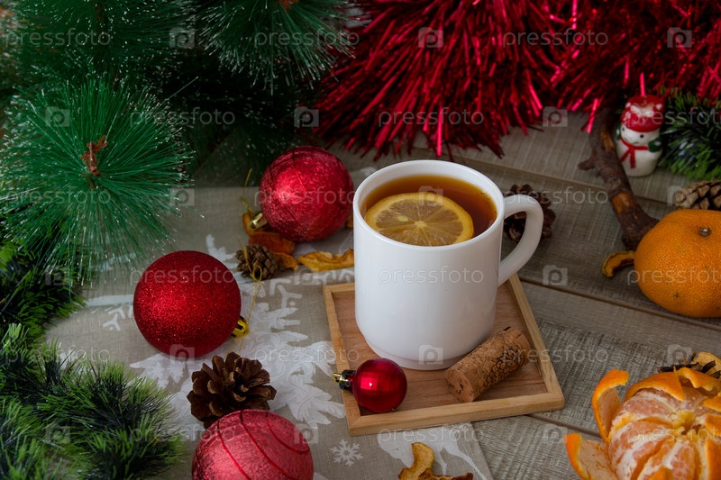 Белая чашка с лимонным чаем на деревянном подстаканнике, новогодний декор, красные рождественские украшения, сосновые ветки, новогодний фон