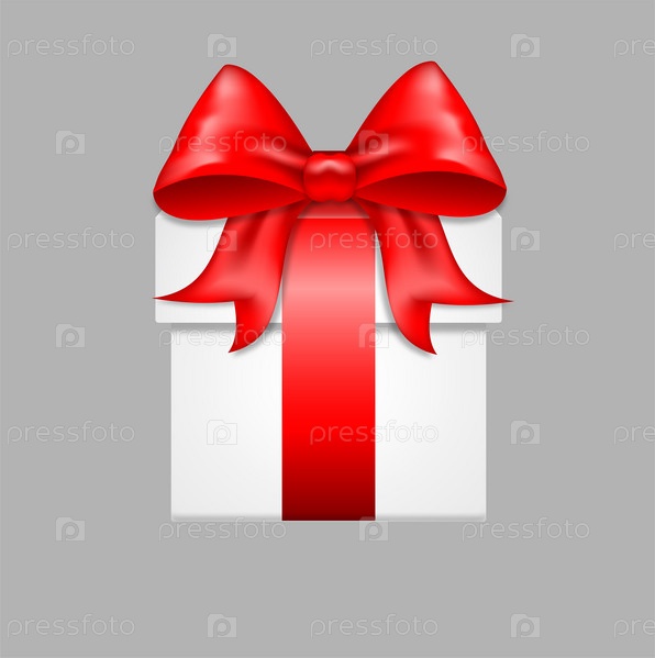 Белая подарочная коробка с красным атласным бантом. Изолированные на сером фоне. Обвязан красной лентой, стоит на поверхности, вид спереди