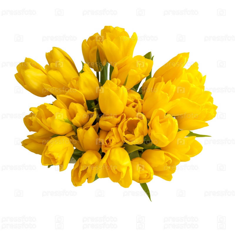 Букет свежих желтых тюльпанов на белом изолированном фоне. Весенние цветы в вазе