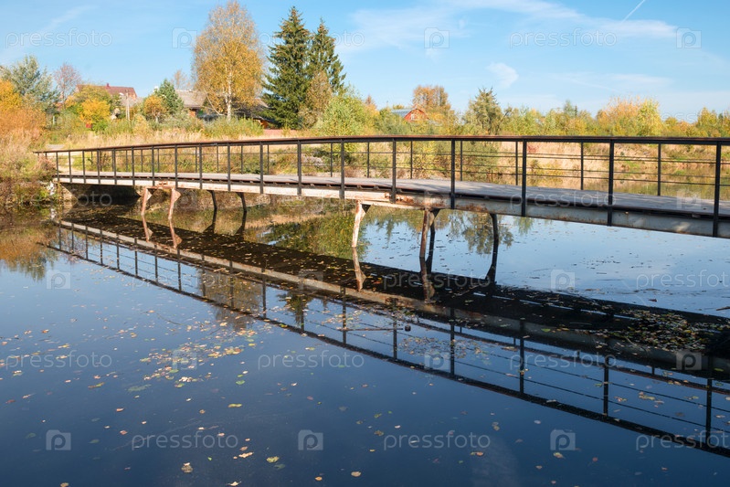 Вид на водный канал в деревне и мост в осенний солнечный день