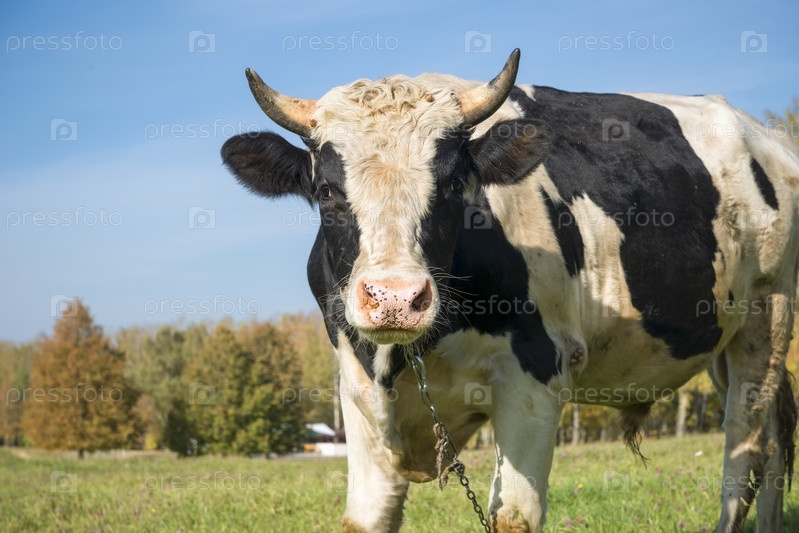 Большой черно-белый бык в осенний день пасется
