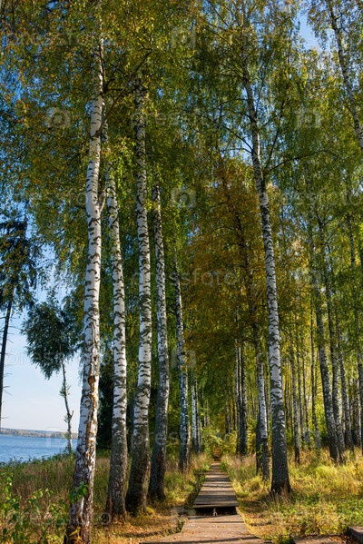 Деревянная дорожка для прогулки по березовой роще в осенний солнечный день