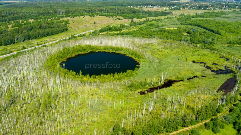 Вид с воздуха на Бездонное озеро в лесу Солнечногорского района Московской области. Россия. С высоты птичьего полета. Озеро идеально круглое и его глубина не определена