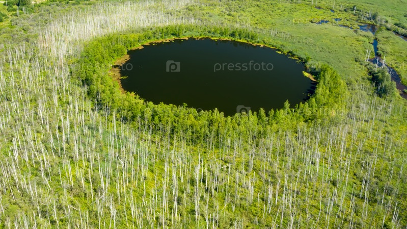 Вид с воздуха на Бездонное озеро в лесу Солнечногорского района Московской области. Россия. С высоты птичьего полета. Озеро идеально круглое и его глубина не определена