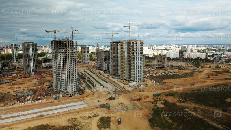 Строительная площадка нового городского квартала. Строительство многоэтажных домов. Аэрофотосъемка