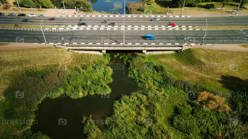 Многополосная городская магистраль. Эстакада через реку. Аэрофотосъемка