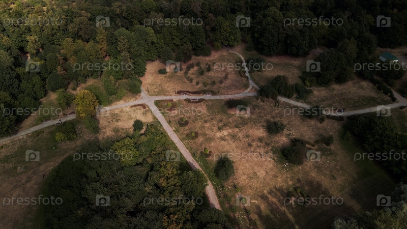 Пешеходные дорожки в городском парке. Старинные скамейки и фонари. Городской парк на рассвете. Аэрофотосъемка