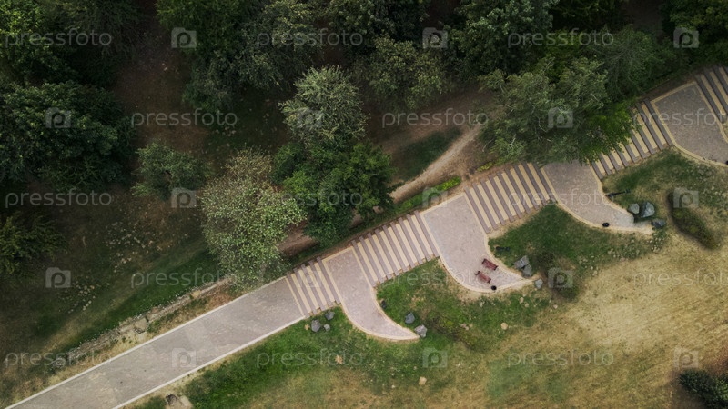 Пешеходные дорожки в городском парке. Старинные скамейки и фонари. Городской парк на рассвете. Аэрофотосъемка