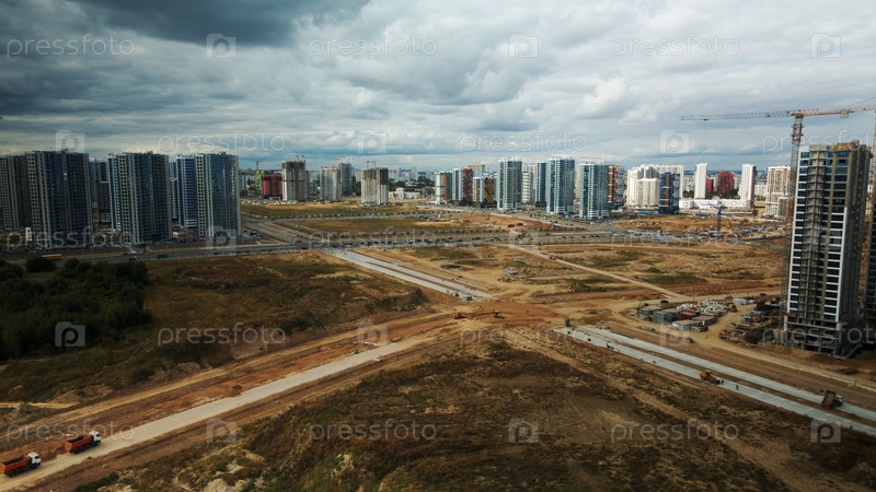 Строительная площадка нового городского квартала. Строительство многоэтажных домов. Аэрофотосъемка