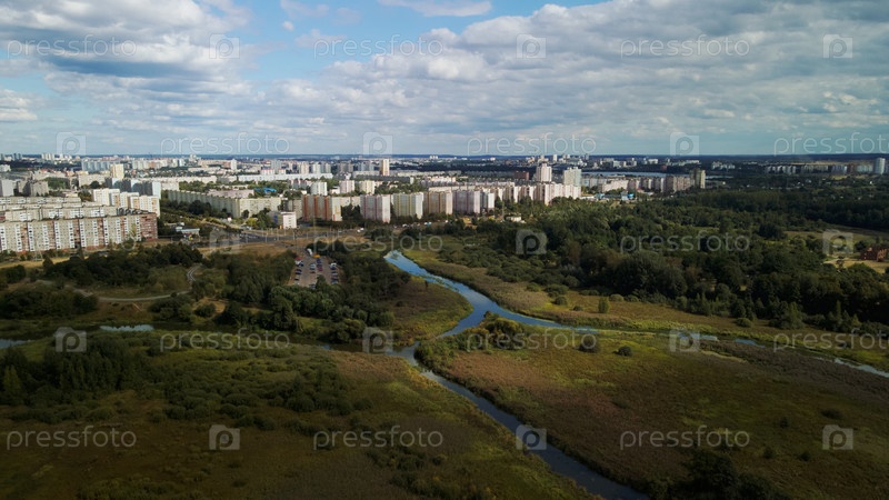 Город с высотными зданиями. Парковая зона на переднем плане. Голубое небо с облаками. Аэрофотосъемка