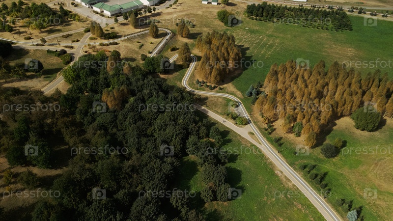 Велосипедная дорожка в городском парке. Городской парк на рассвете. Аэрофотосъемка