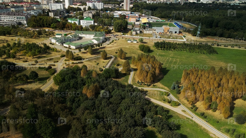 Велосипедная дорожка в городском парке. Городской парк на рассвете. Аэрофотосъемка