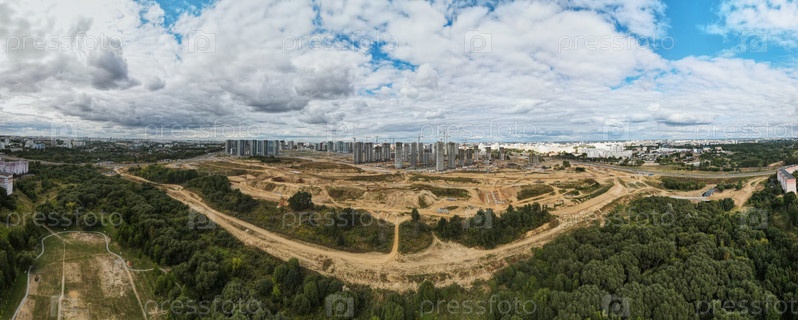 Строительная площадка нового городского квартала. Строительство многоэтажных домов. Панорамное фото. Аэрофотосъемка