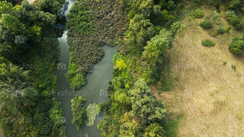Извилистая река в городском парке. Не ухоженное место. Аэрофотосъемка
