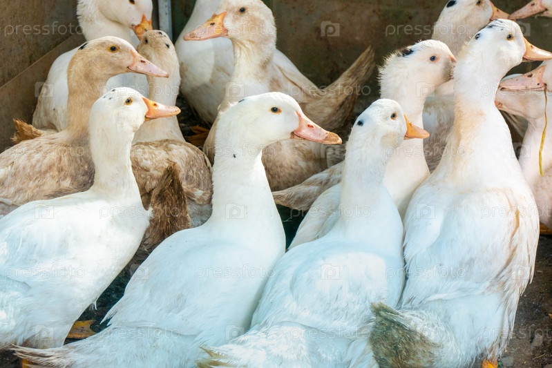 Стая белых домашних гусей. Кормление уток ранчо