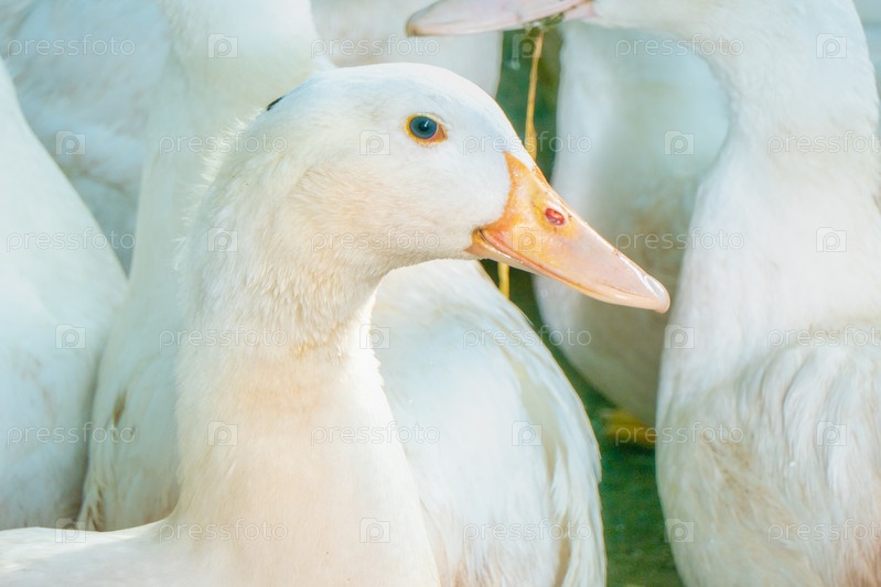 Стая белых домашних гусей. Кормление уток ранчо