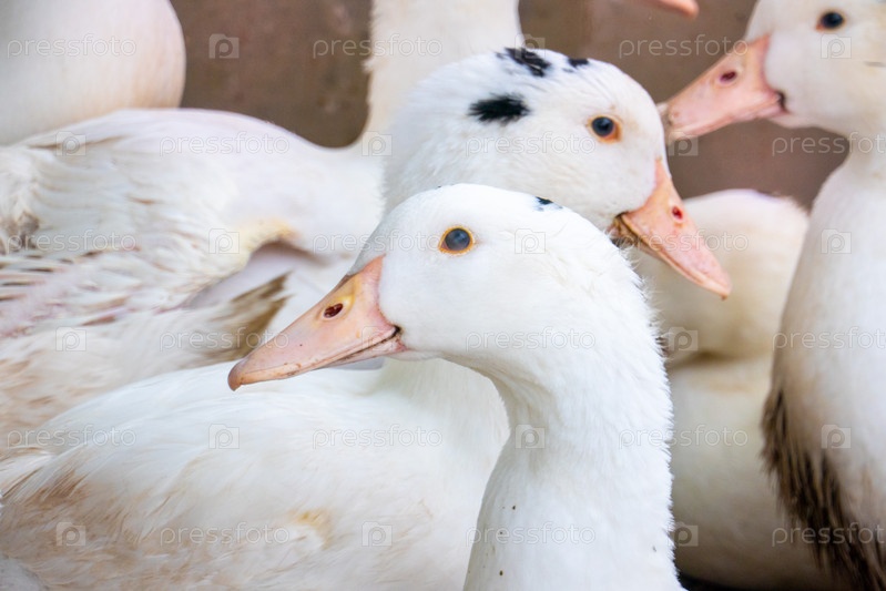Стая белых домашних гусей. Кормление уток ранчо