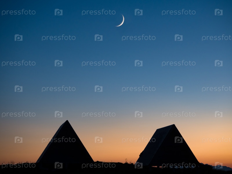 Новолуние на градиентном сумеречном небе над силуэтами двух зданий