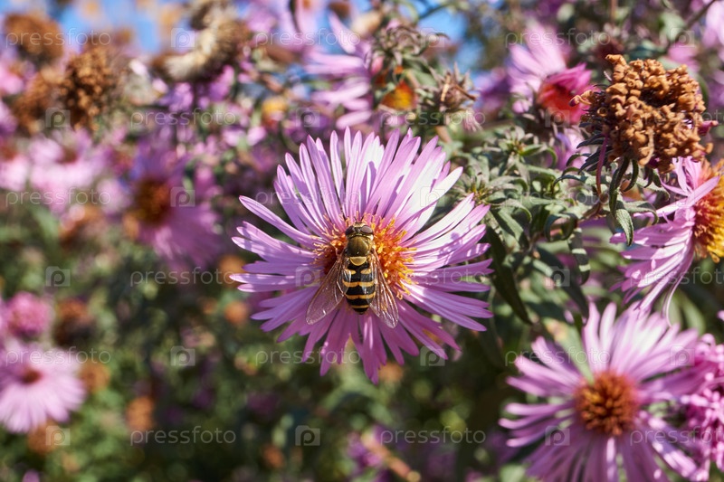 Syrphus ribesii) собирает нектар и пыльцу из цветов многолетнего астра