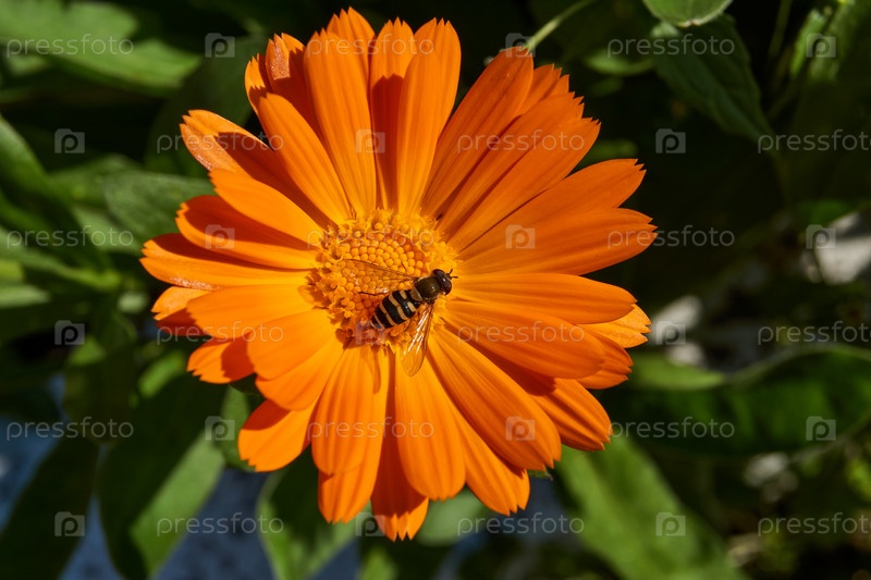 Syrphus ribesii) собирает нектар и пыльцу из цветов календулы