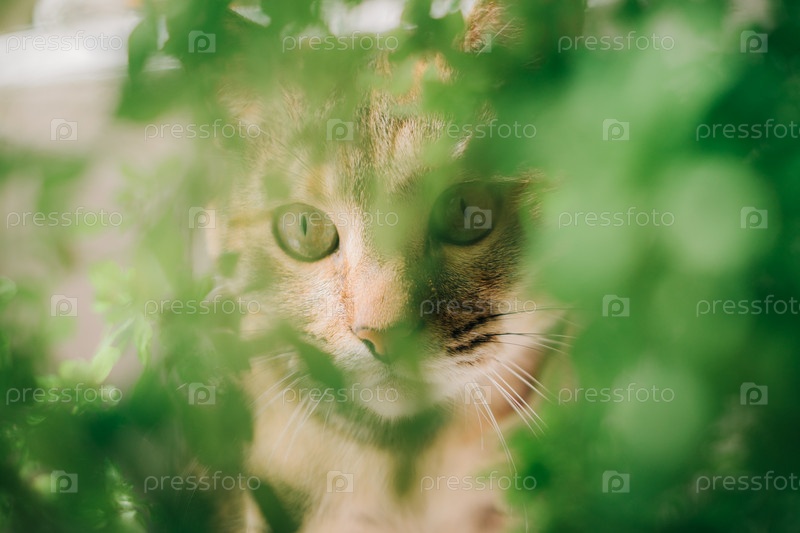 Крупным планом портрет домашней кошки через зеленые листья домашних растений. Кошка и растения