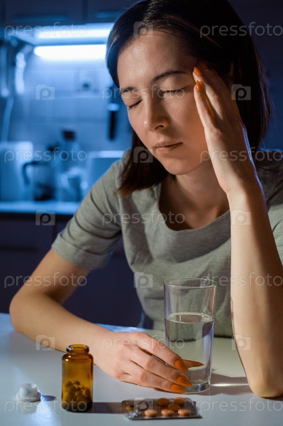 Молодая женщина с головной болью пьет таблетки ночью на кухне