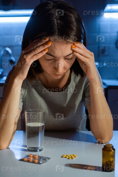 Молодая женщина сидит ночью за кухонным столом с головной болью. Рядом лежат таблетки и стакан воды. Хозяйка держит голову руками