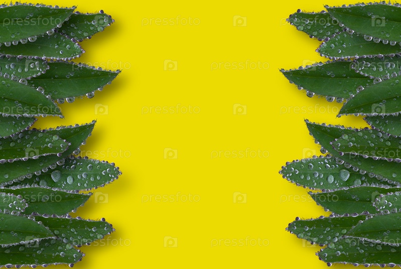 Листья люпина с каплями воды по краям с двух сторон на желтом фоне. Место для текста