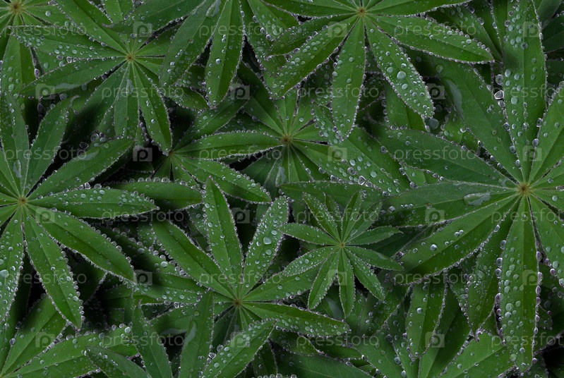 Заполненный полностью фон из листьев люпина с каплями воды после дождя. Место для текста
