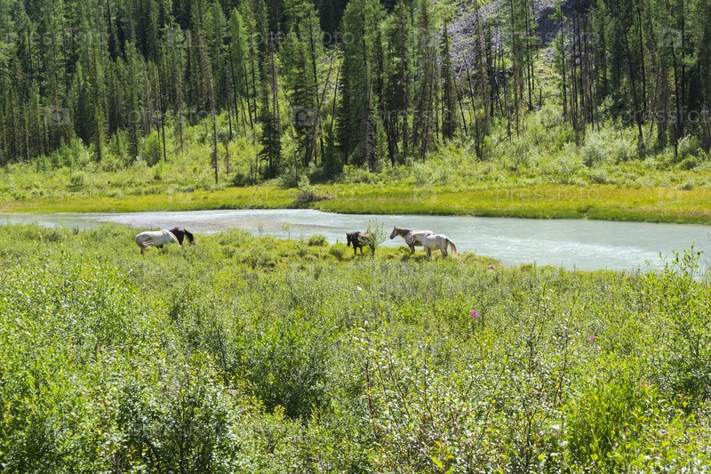 Лошади пасутся на берегу реки Шавла. Долина реки между Шавлинскими озерами и впадением притока Ештыкол. Август, Горный Алтай