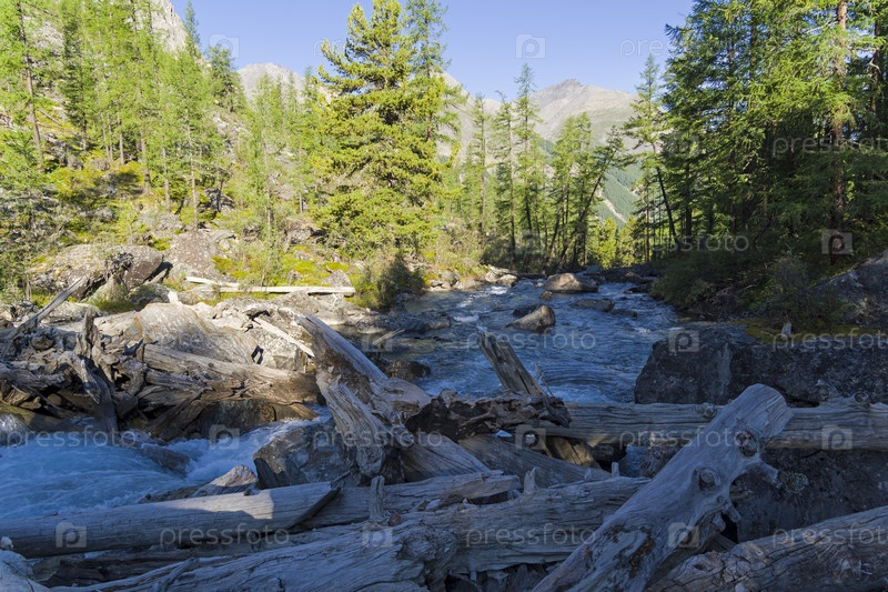 Завал из бревен на выходе реки Шавла из Большого (нижнего) Шавлинского озера. Солнечное летнее утро. Горный Алтай