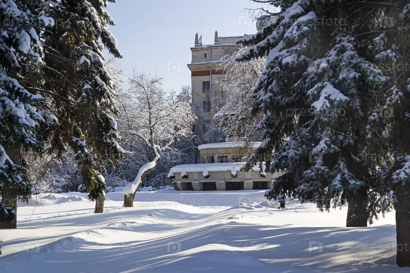 Заснеженный сквер перед Главным зданием МГУ. между физическим и химическим факультетами. Солнечный день в феврале