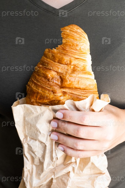 Одна женская рука держит вкусный круассан на коричневом фоне, концепция нездоровой пищи