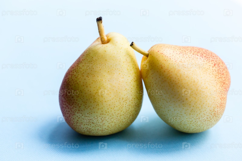 Две спелые сладкие органические груши на синем фоне. Фрукты для веганской диеты