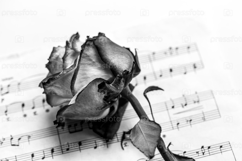 Нотный лист и мертвая роза. Идея концепции любви к музыке для музыкального вдохновения