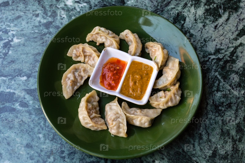 Непальские пельмени момо, приготовленные на пару, подаются с томатным чатни, традиционной азиатской едой. Вид сверху