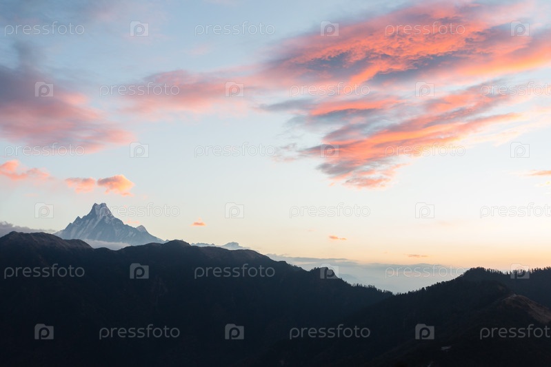Вид на гору Мачапучаре (с непальского означает «рыбий хвост») с холма Пун (3210 м) на восходе солнца, заповедник Аннапурна, Гималаи, Непал