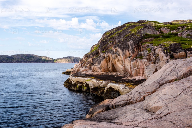 Северное полярное лето. Красивое скалистое побережье Баренцева моря, Северный Ледовитый океан, Россия