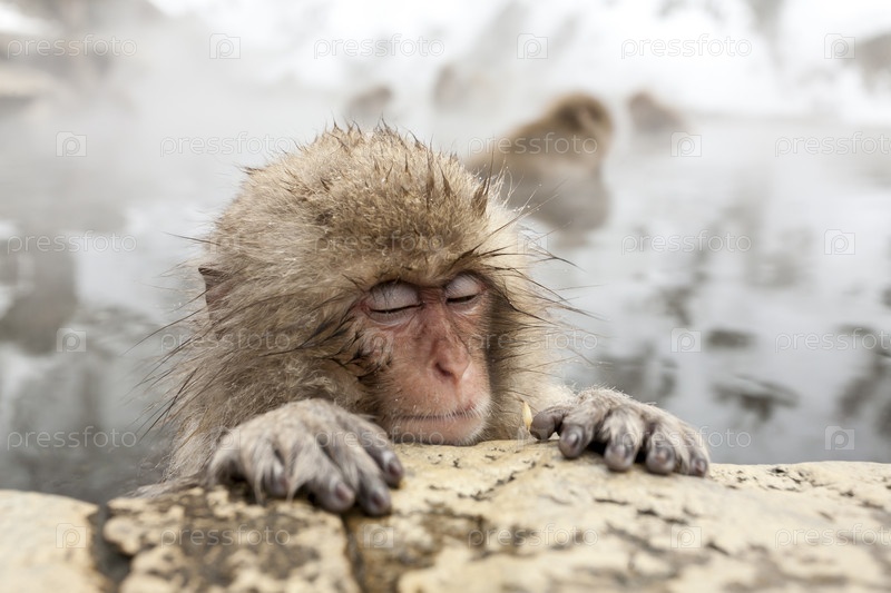 Милая японская снежная обезьяна спит в горячем источнике. Префектура Нагано, Япония
