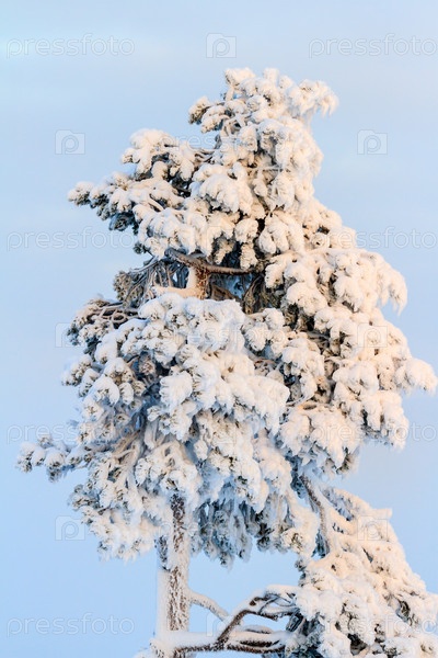 Сосна покрытая снегом в морозный зимний день