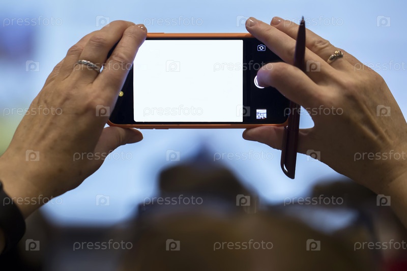 26.09. 2019 Беларусь, город Минск. Встреча и конференция банковских служащих. Руки держат телефон с пустым экраном. Светящийся пустой экран смартфона