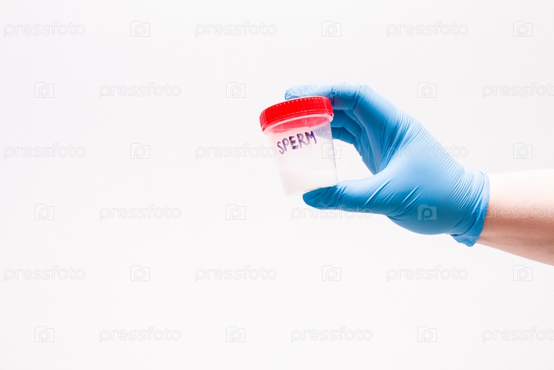 Мужская рука в синей одноразовой медицинской перчатке держит банку для анализа спермы, надпись на банке "сперма", белый фон, пространство для копирования, лаборатория и концепция анализа