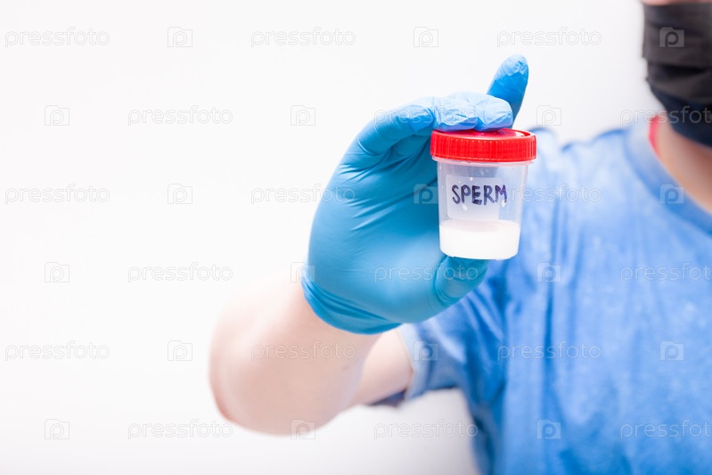 Мужчина в очках и медицинской черной маске держит в руке банку со спермой. рука в синей одноразовой перчатке, тестовая банка с надписью "сперма", размытый фон, пространство для копирования