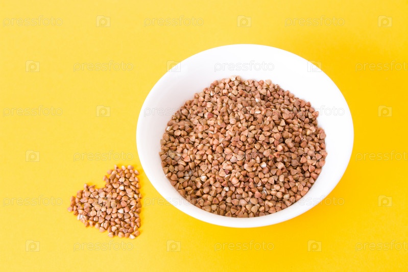 Сырая гречка в маленькой белой тарелке и гречневое сердце на желтом фоне копией пространства