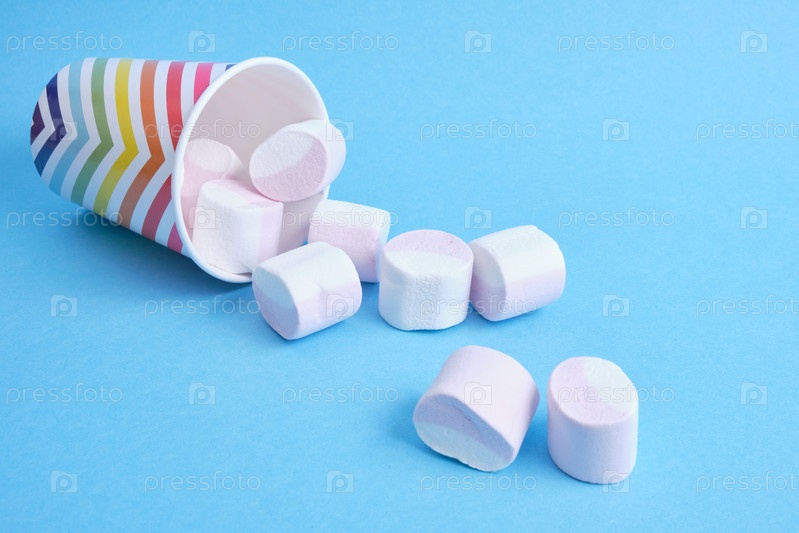 Зефир с фруктовым соком в праздничном бумажном стаканчике с ярким геометрическим узором на синем фоне, пространство для копирования